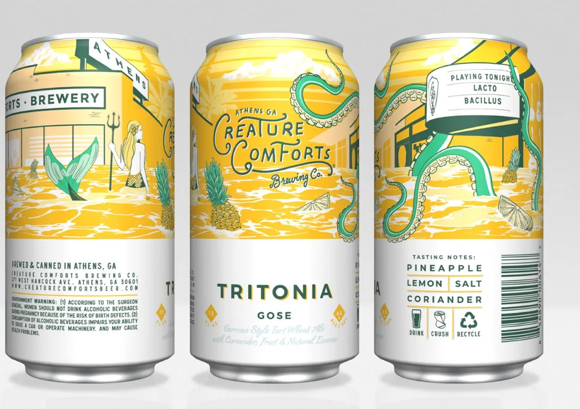 Tritonia es el gose agrio y refrescante de Creature Comforts con toques de cilantro y sal marina. La cerveza tiene un 4,5 por ciento de ABV. Además de ofrecer dos versiones de su Berliner Weisse Athena Paradiso con frutas cada año, la cervecería también lanza dos versiones de Tritonia que destacan diferentes frutas cada año. La variante Tritonia que la cervecería lanzó anteriormente incluye pepino y lima, y a la nueva variante se agregaron piña y limón.