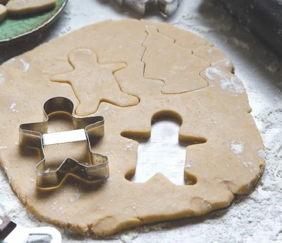 - Extienda cada disco sobre una superficie enharinada hasta que tenga un grosor de ½ pulgada. Cortar con las formas deseadas. Transfiera las galletas a una bandeja para hornear sin engrasar a una distancia de al menos 1 pulgada. Coloque la bandeja para hornear en el congelador durante 10 minutos. Vuelva a formar los restos de masa en un disco, refrigere hasta que esté listo para enrollar, cortar, congelar y hornear.